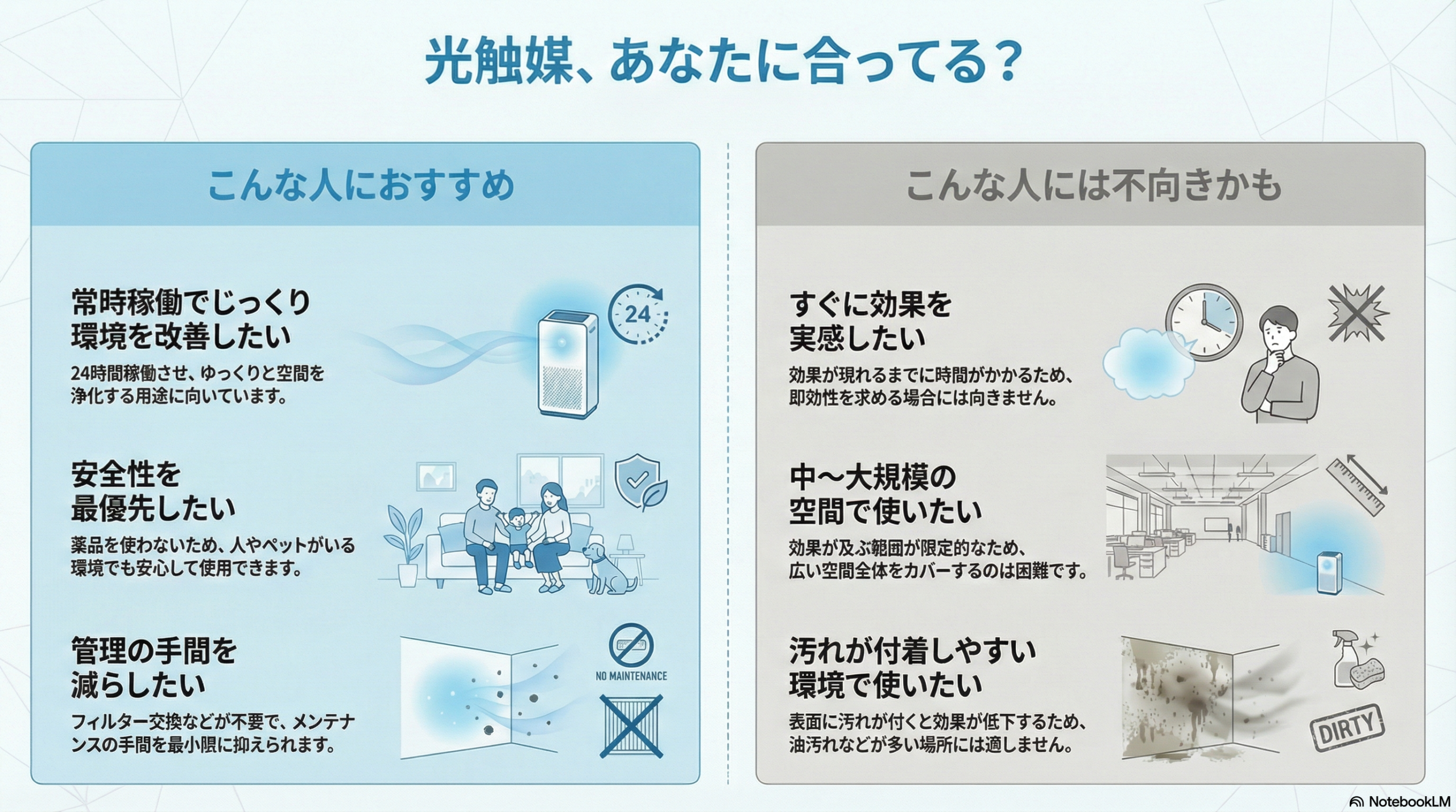 光触媒は「安全性」に優れる一方で、「即効性」や「対応範囲」には限界があります。